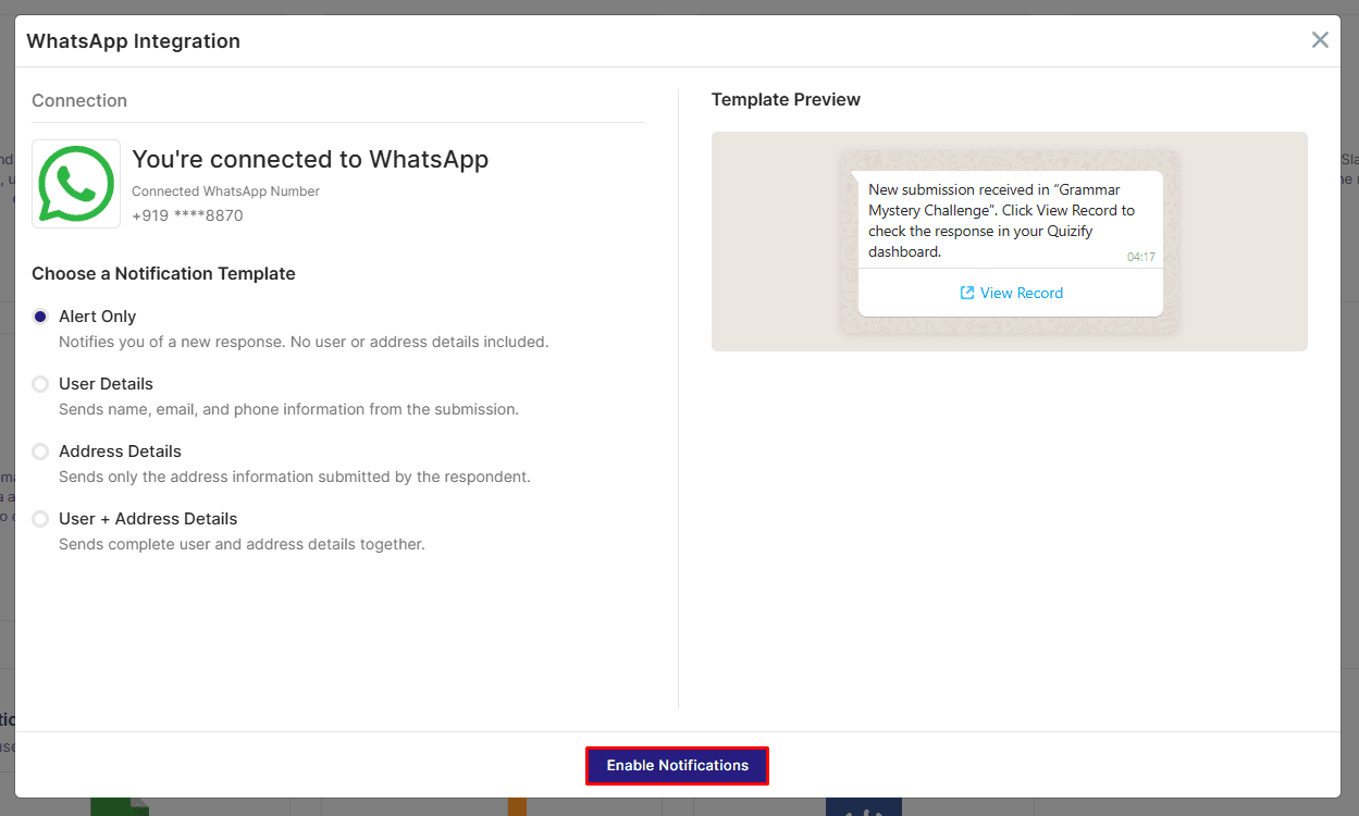 Integrating WhatsApp with Quizify makes real-time funnel notifications effortless by automatically sending structured submission alerts, user details, address information, or combined data directly to your connected WhatsApp number based on the selected template, eliminating the need to manually check submissions and ensuring you receive important lead information instantly so you can respond faster and manage inquiries more efficiently.