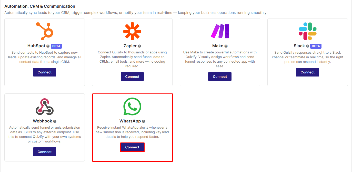 Follow these steps to connect your Quizify funnel with WhatsApp and start syncing responses instantly: